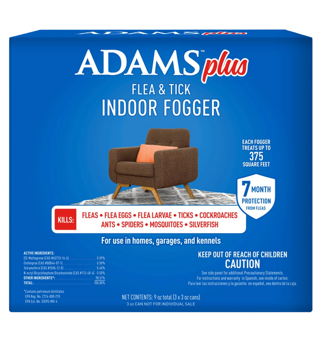 Adams Plus Flea & Tick Indoor Fogger kills fleas, flea eggs and larvae, ticks, cockroaches, ants, spiders, mosquitoes, silverfish, earwigs, wasps, and flies. One easy-to-use fogger covers 3000 cubic feet and is stain-free. Adams Plus dog fogger is formulated with (S)-Methoprene to help kill and prevent the development of fleas, protecting your home for up to seven months. With 5% of fleas living on your pet and the remaining 95% living in your home or yard, Adams products are designed to provide you with the power to prevent pests in your home and in your yard. To complete your flea and tick control system try one of the many Adams flea and tick collars designed specifically for your dog, puppy, cat, or kitten. Also try Adams Flea & Tick Home Spray, specifically designed to use inside your home and Adams Yard & Garden Spray, designed to use outside in your yard.