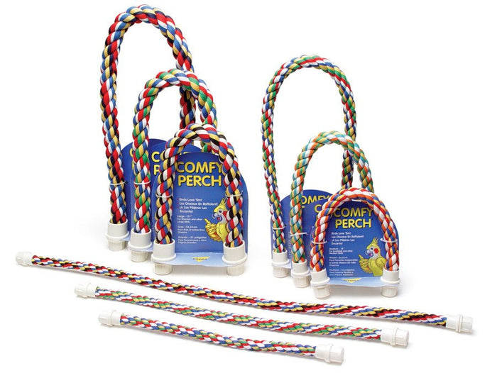 JW Pet's Comfy Perch is a versatile rope perch that provides entertainment and exercise for pet birds of all sizes. These flexible bird perches for parrots are easy to bend and twist into a variety of creative shapes, allowing pet parents to keep birds stimulated with different perch styles. Modifying the bird cage with perch variations promotes exercise and improves birds' grip strength as they climb a variety of perch shapes. The bright colors attracts birds to the perch and the soft, curved rope provides gentle support for birds' feet for long-term joint health. Plastic, easy-twist attachments ensure convenient placement in bird cages and allow pet parents to install the rope horizontally or vertically.