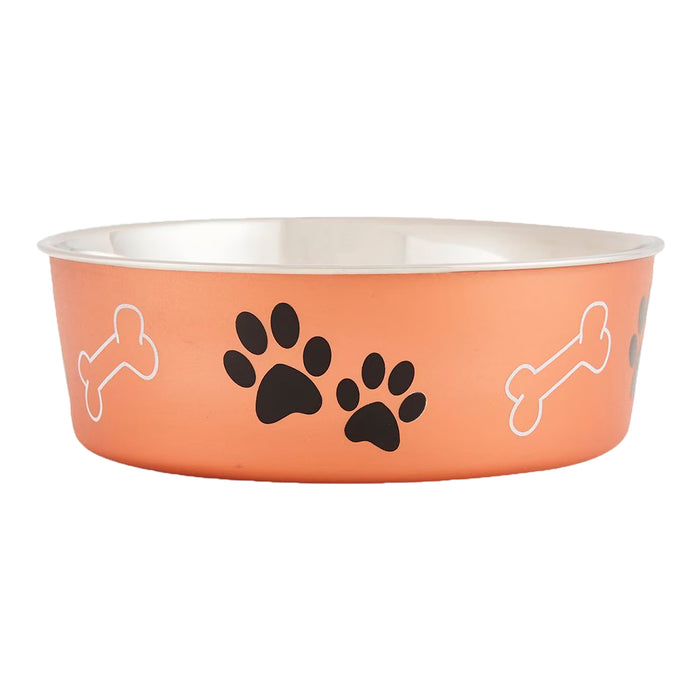 - Loving Pets Metallic Bella Dog Bowl Copper's exterior is mostly composed of poly-resin for durability and visual appeal. Because stainless steel is non-porous and resistant to bacteria, it was used to construct the interior, guaranteeing a hygienic and secure surface for the canine's food and drink. To improve stability while in use, the base has a detachable rubber ring.