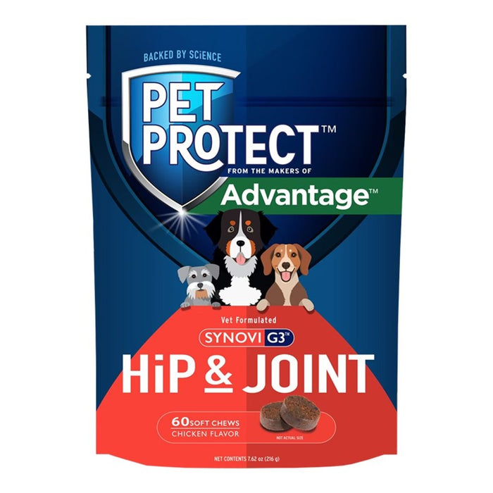 From the makers of Advantage, Pet Protect Hip & Joint for dogs features Synovi G3, a formula developed by veterinarians that has been sold in vet clinics These hip and joint chews for dogs include naturally derived ingredients to support healthy hip and joint flexibility, cartilage, and normal muscle performance Pet Protect Hip & Joint dog supplements are powered by Glucosamine MSM, Green Lipped Mussel, Fish Oil (EPA and DHA), and Creatine Monohydrate